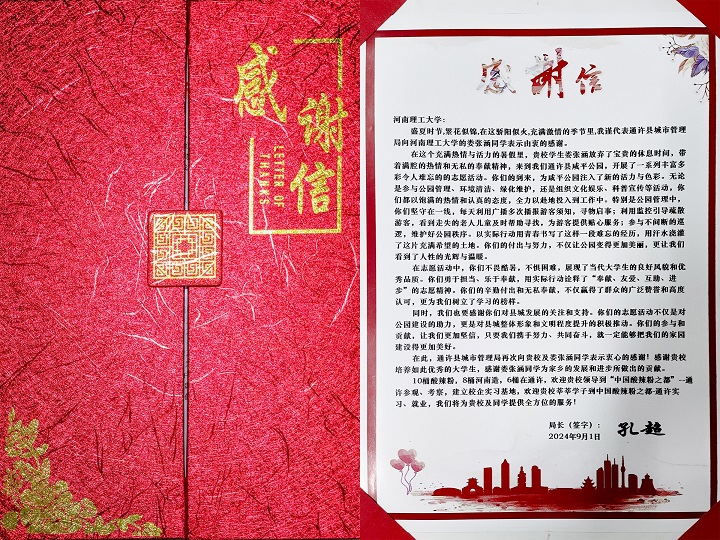 榜样如灯塔,照亮前行路。近日,5g影院 收到了来自河南省开封市通许县城市管理局的感谢信,对5g影院 自动化2303班娄张涵同学在暑期的志愿活动表示高度赞扬。
