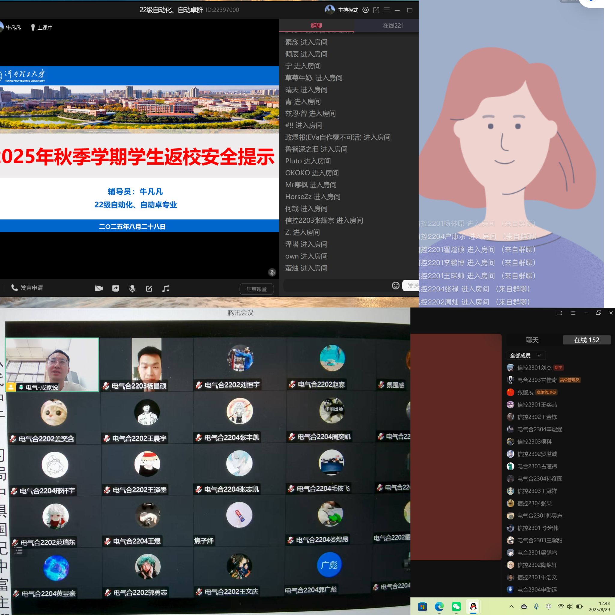 为深入贯彻落实《5g影院 关于做好2025年秋季学期开学工作的通知》要求,扎实做好学生教育管理与服务保障工作,确保全体学生平安返校,帮助学生快速调整状态,8月28日-29日,电气学校以年级为单位,组织全体学生召开秋季开学线上教育主题班会,为新学期学习生活筑牢基础。