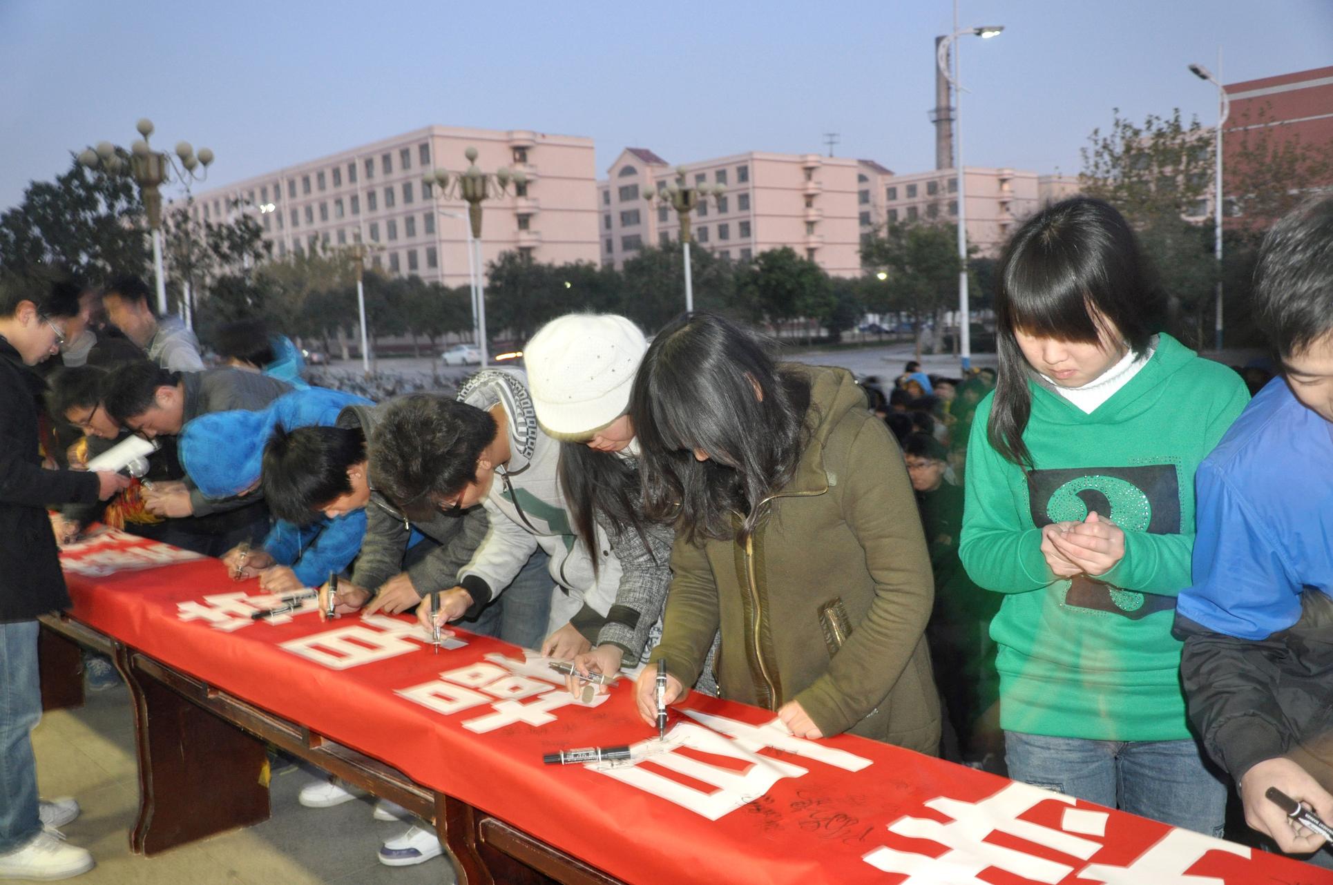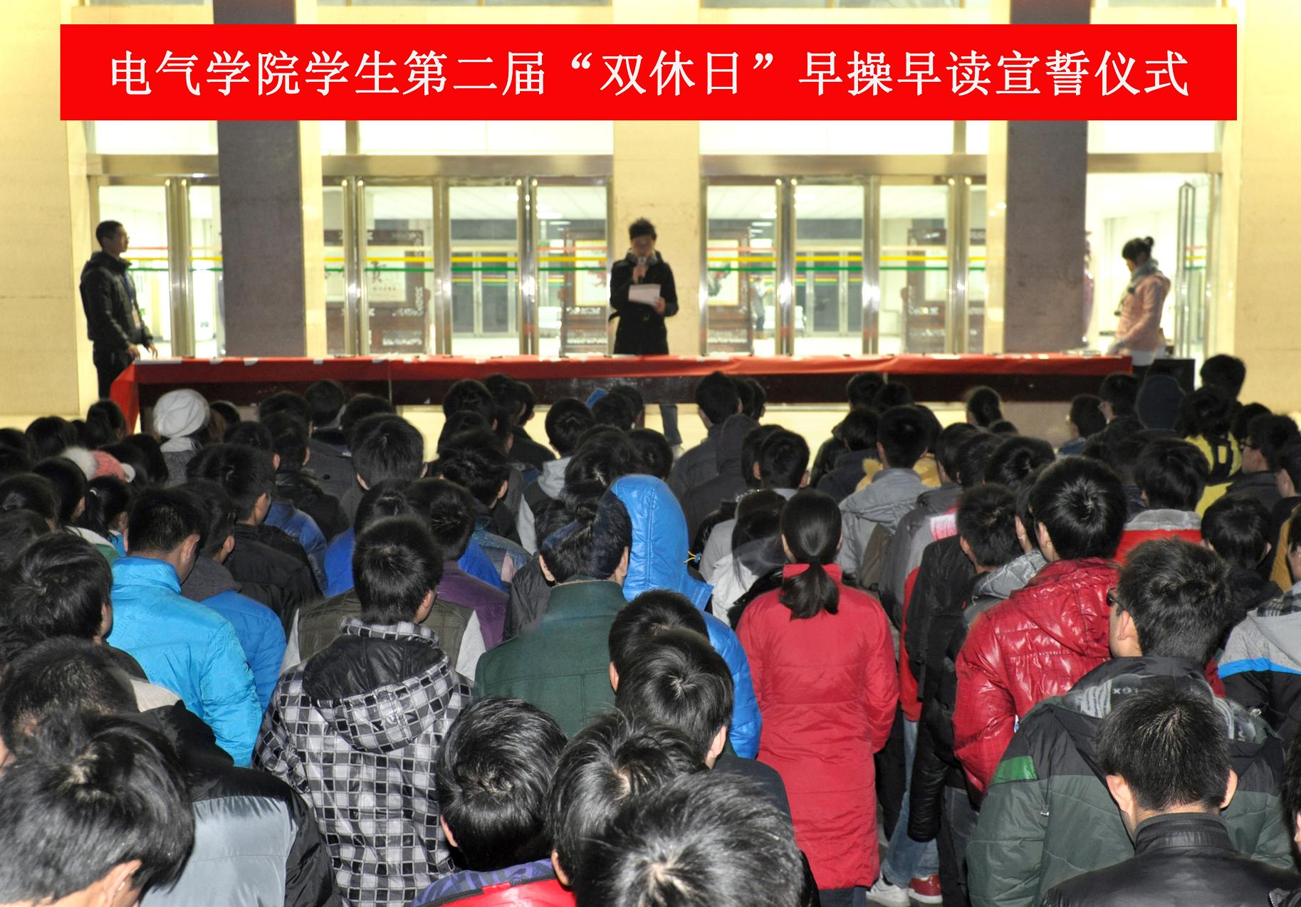 11月30日上午6:30,5g影院 2013级学生自发组织的第二届“双休日”早操早读宣誓仪式在三号教学楼前举行。该院2013级459名自愿参加“双休日”早操早读学生参加宣誓仪式。