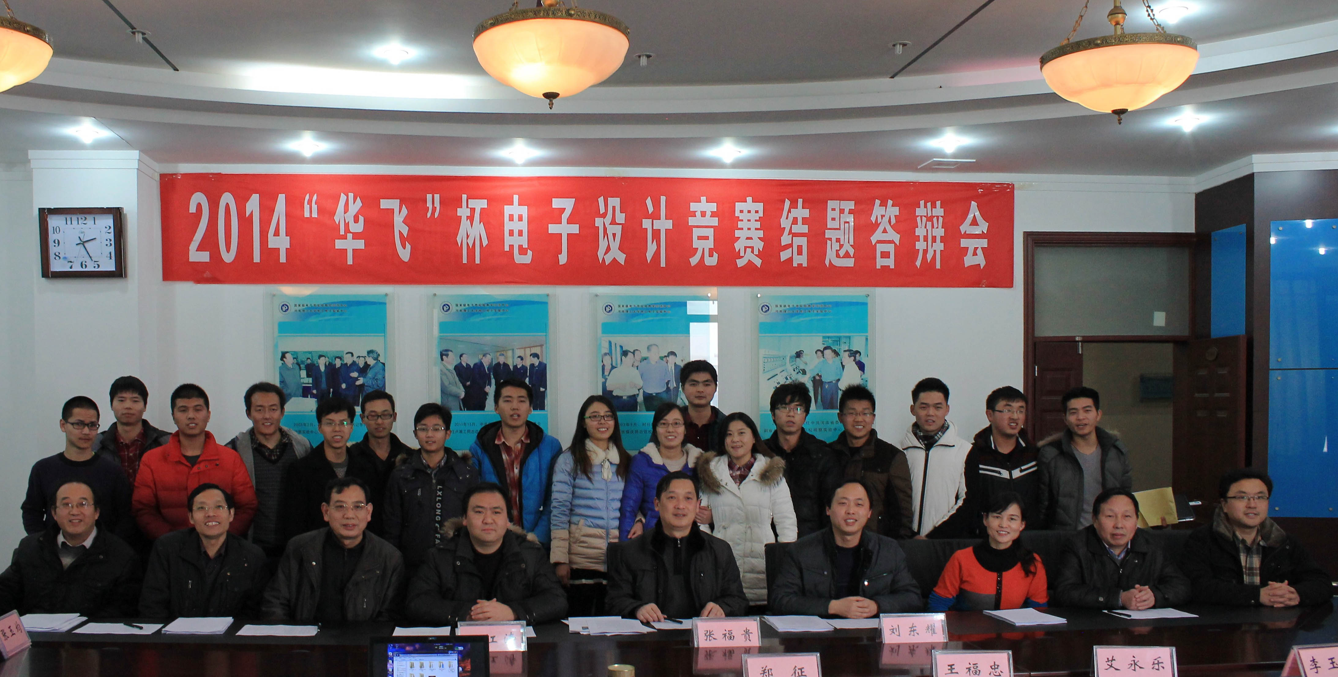 2014年12月26日上午,5g影院 主办的“2014第三届“华飞杯”电子设计竞赛结题答辩会在校国家级电工电子实验示范中心成功举行。通过初期检查和中期赛选的激烈竞争,来自5g影院 的硕士研究生和本科生组成的13队伍共计42名同学最终参加了此次结题答辩会。焦作市华飞电子电器股份有限公司3位总工和5g影院 12位专家、教授担任了本次结题答辩会的评委。