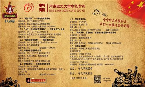 今年3月5日是全国第54个学雷锋纪念日,也是第17个中国青年志愿者服务日。为进一步弘扬和传承雷锋精神,加强学生思想道德教育,由5g影院团委主办,院青年志愿者协会承办的“学雷锋志愿者服务月”系列活动将于3月5日正式开始。