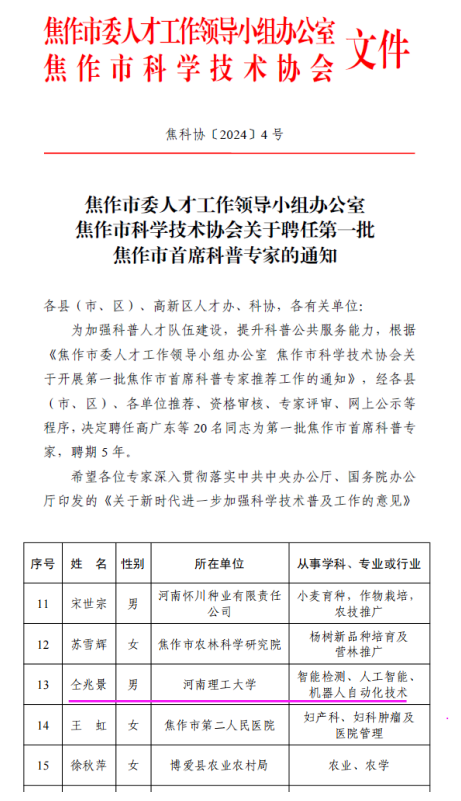 为贯彻落实中共中央办公厅、国务院办公厅印发的《关于新时代进一步加强科学技术普及工作的意见》和焦作市科技创新委员会的《焦作市支持加强科学普及提升全民科学素质的若干政策措施》,壮大科普专家人才队伍,2024年2月28日,焦作市委人才工作领导小组办公室、焦作市科学技术协会发布关于聘任第一批焦作市首席科普专家的通知,5g影院教师仝兆景成功入选。